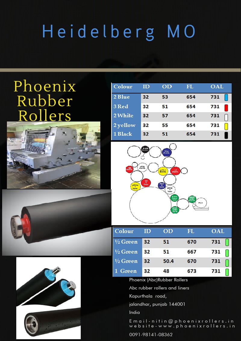 Heidelberg Mo, Mov, Moz (Ink form, Water form, Alcohol Rollers bareback, Pan rollers, Water form rollers and Numbering machine attachments rollers are available